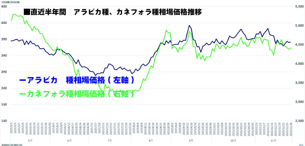 ①直近半年間のアラビカ種とカネフォラ種の相場価格推移 ・・・過去半年間の期間でどれぐらいコーヒーの原料価格が変動しているか