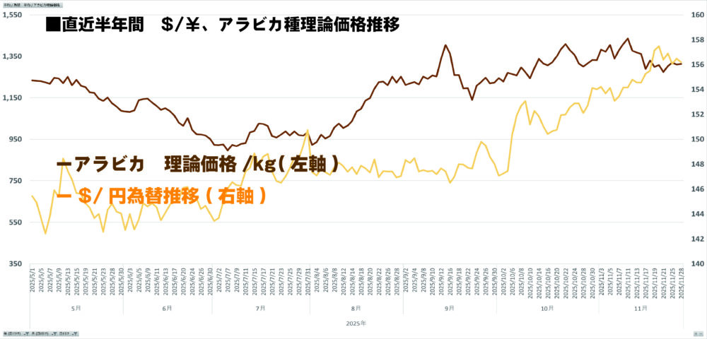 ②直近半年間の為替($/円)推移と、アラビカ種の理論価格※ ・・・為替の変動によってどれぐらいコーヒーの原料価格が変動しているか