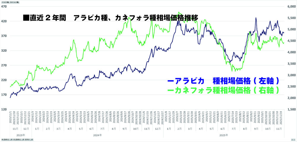③直近2年間 アラビカ種、カネフォラ種相場価格推移
