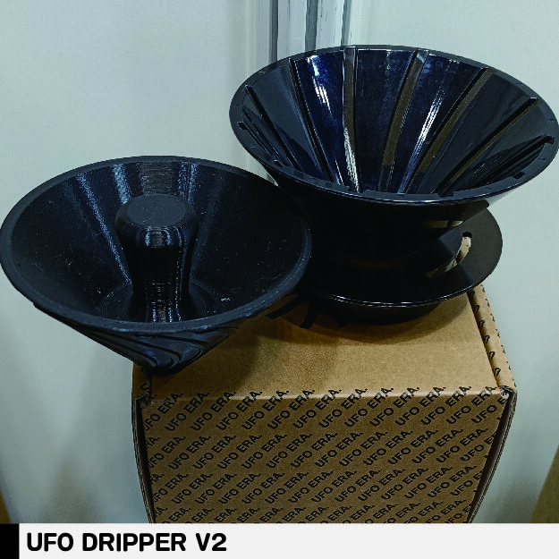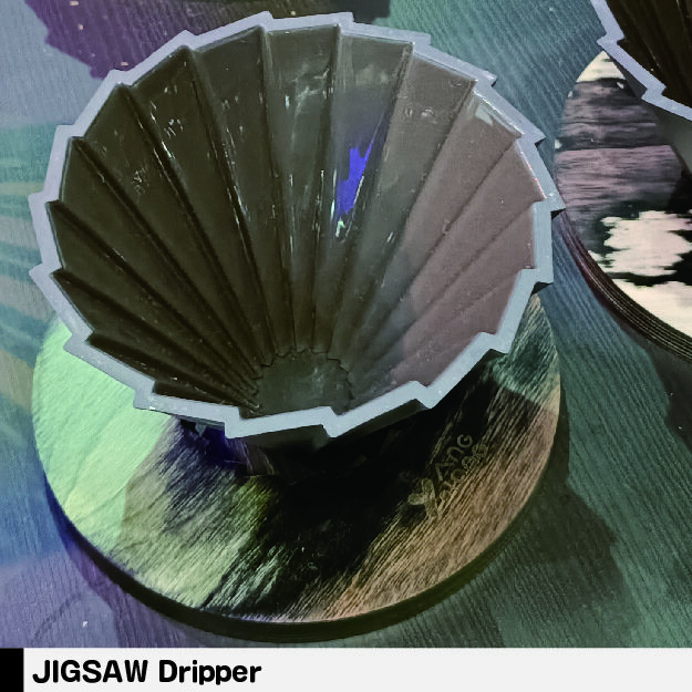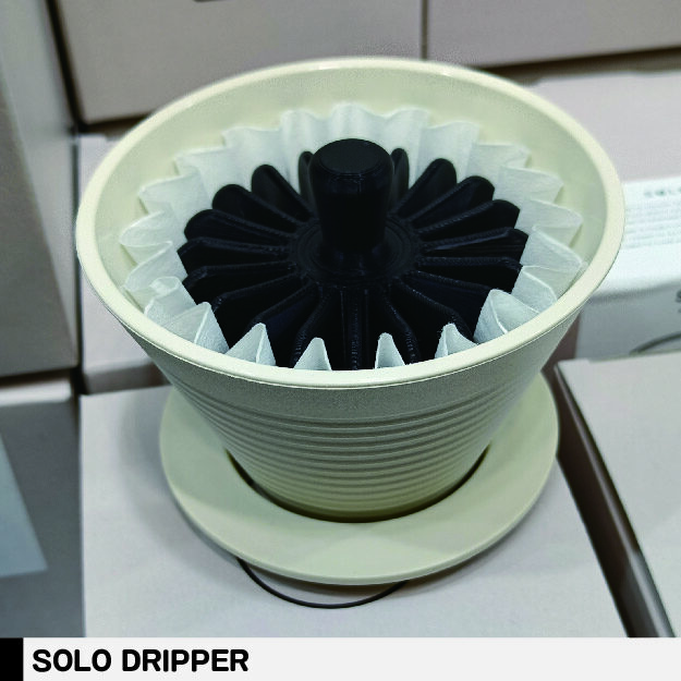 円錐に見えますが、扇形のドリッパー。扇形の底部に一旦湯が溜まる構造と、フラワー形状の独特のリブによってコーヒーの膨らみを妨げない仕組みがあるアイデアが詰まりまくったドリッパー。