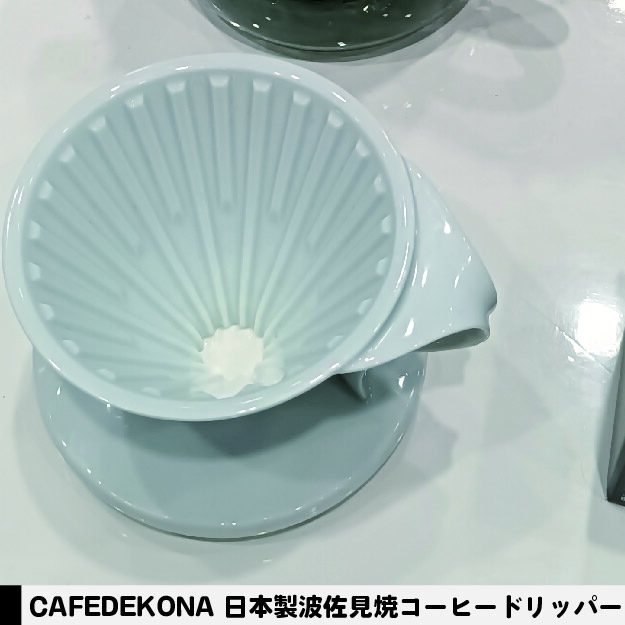縦型の長いリブがあるドリッパー。波佐見焼だけではなく樹脂製もあり。円錐型のドリッパーだけど取っ手をつけてくれてるのが優しい。